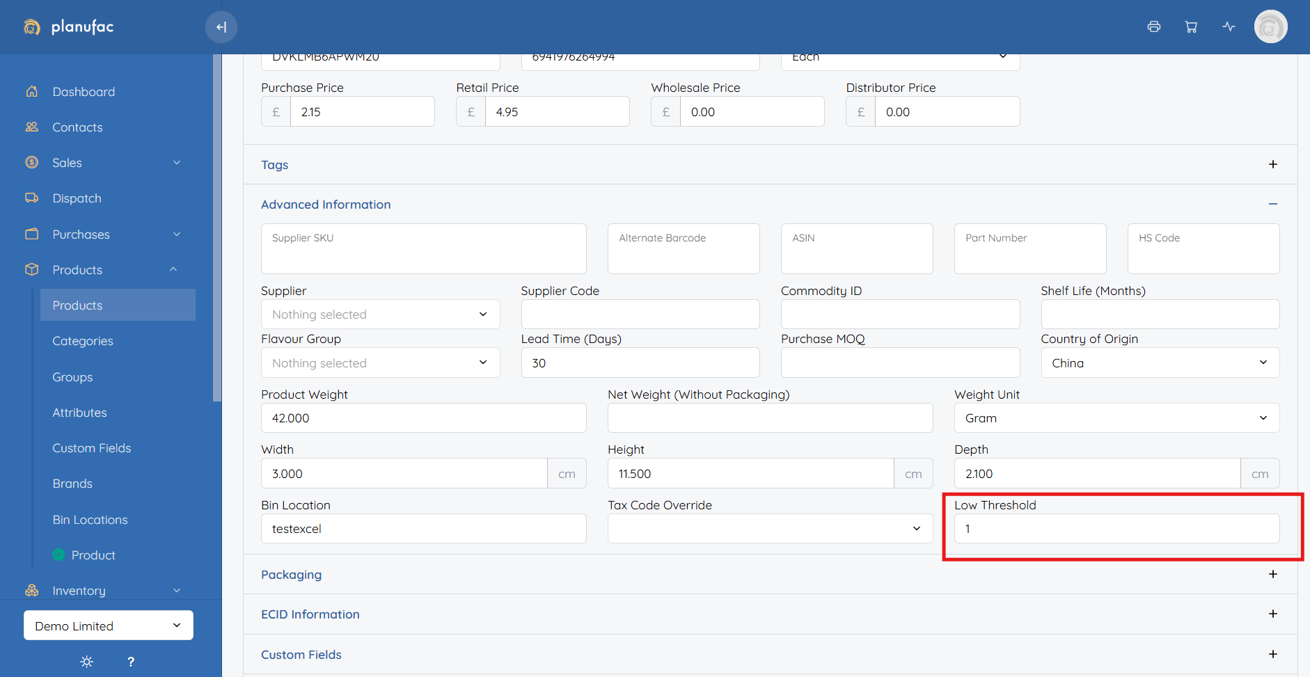 The new Low Threshold field captures the minimum stock level that the business aims to maintain, based on historical sales data and forecasting analysis. It represents the level below which stock is considered low, helping the also the newly released Custom forecasting dashboard https://my.planufac.com/reports/salesforecast which highlights potential inventory risks and support planning decisions.