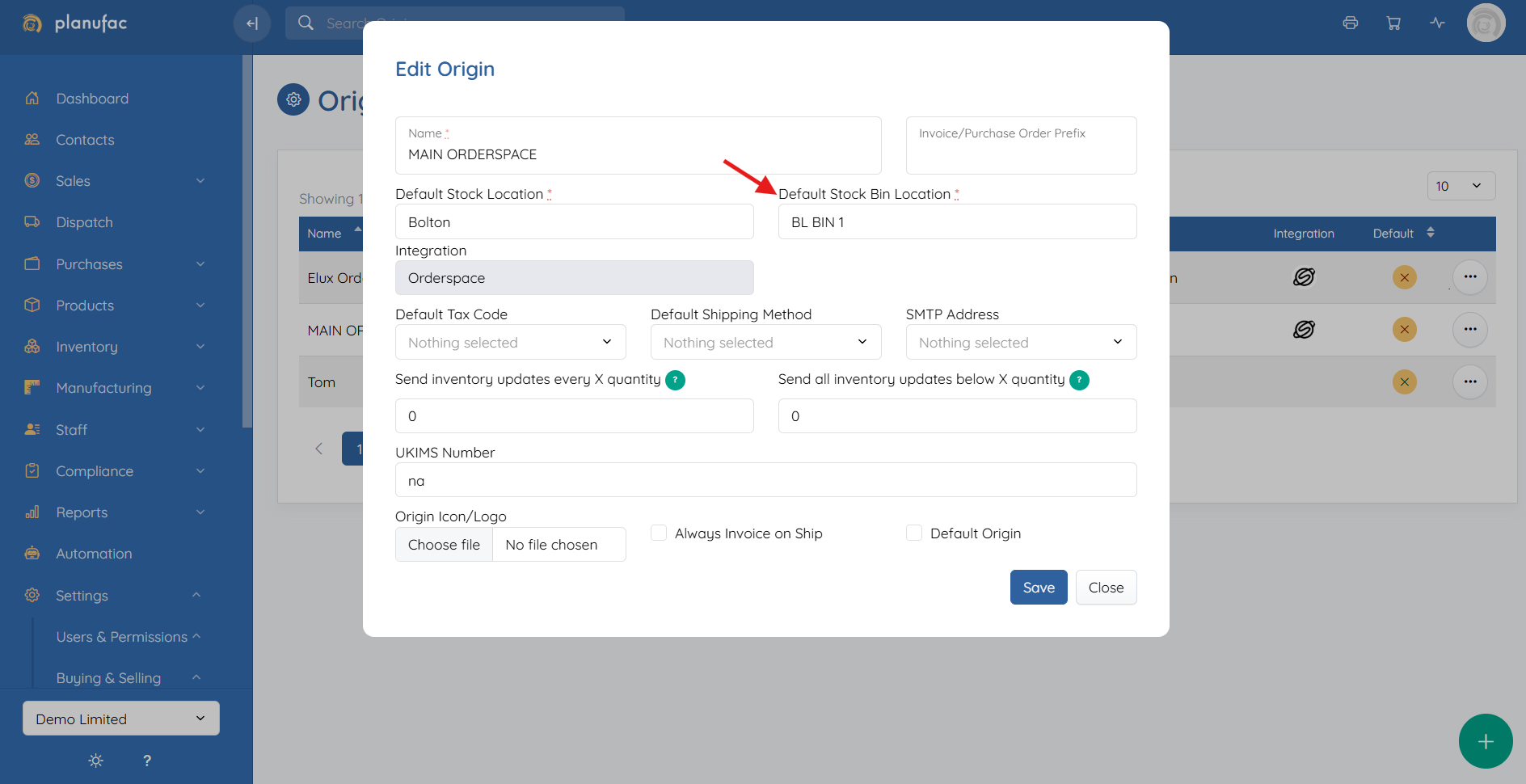 EDIT BIN LOCATION IN ORIGIN