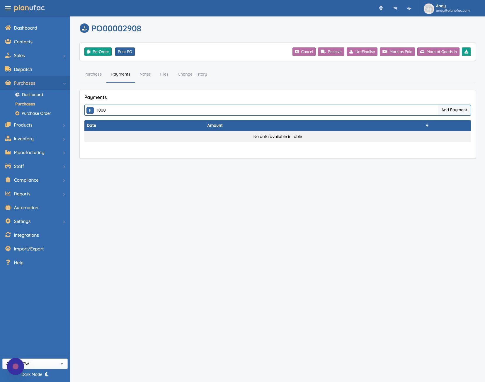 Sometimes you may wish to track partial payments against a purchase order. This may be relevant if you are paying deposits or calling off stock.